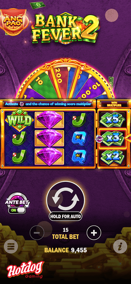 Bank Fever 2 brings back your favorite 3 by 3 Slot with crazy multiplier wins but with an additional feature of Fortune Wheel. Activating the ante bet will unlock multipliers in the fortune wheel board and win up to 1500x.