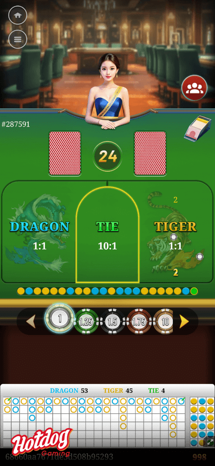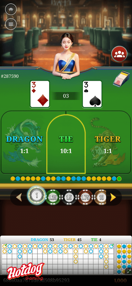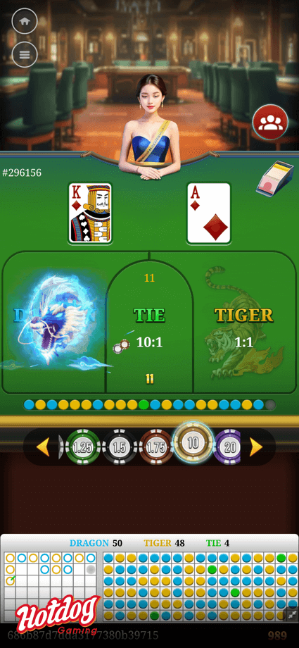 Dragon Tiger Fight is a simple card game similar to Baccarat. The game is played with one standard 52-card deck (excluding Joker). The players predict the game result and bet on the desired options.
