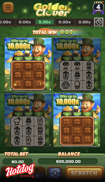 Welcome to Golden Clover! Enter a Scottish world of luck and chase treasures hidden in a 3x3 grid. Scratch across eight winning lines, and if you reveal a pot of gold, the prize on that line is yours. With every line full of possibilities, fortune may shine with every scratch?ill you find your golden clover today?